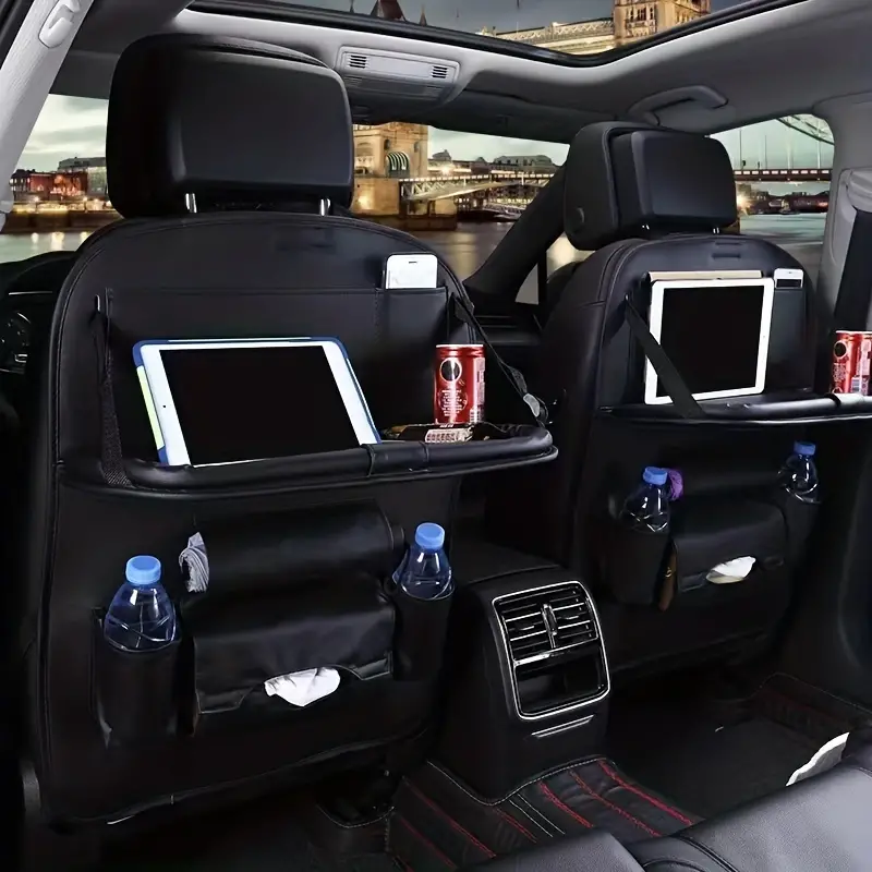 11) With this back seat organizer you can now have more room and safely sore your items more efficiently Storage Pockets Kick Mats Car Back Seat Protectors, Tissue Box cup Holder, Laptop Table Truck Eating Tray For Parking Only.